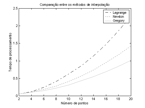 Na figura 1 podemos verificar que o método Gregory-Newton é o mais eficiente para a arquitetura PC. A desvantagem na utilização deste método, é a exigência de que as abscissas dos pontos a serem utilizados para o polinômio interpolador de grau n, devam ser necessariamente eqüidistante.
