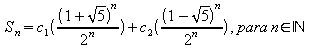 Dessa forma, escreve-se S(n) para SFIB(n) e tem-se S0 = S1 = 1 e Sn = Sn -1 + Sn-2 para n >= 2. Assim, observa-se que a = b = 1 e x2 - x - 1 = 0. Pela equação do segundo grau verifica-se as seguintes raízes