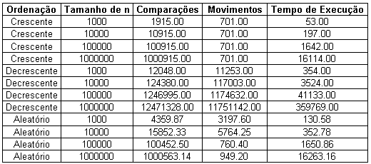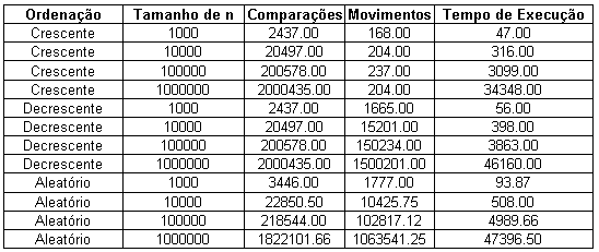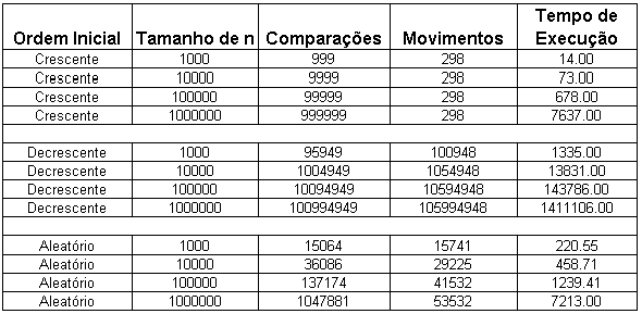 Ainda com relação a tabela 11 verifica-se que o tempo de execução é menor na ordem crescente e maior na ordem decrescente. Sendo o número de comparações e movimentos de registros os mesmos uma explicação para tais resultados seria o fato de tempos distintos para ler elementos em posições distintas. Destaca-se que o aumento de n implica no aumento do tempo de execução.