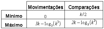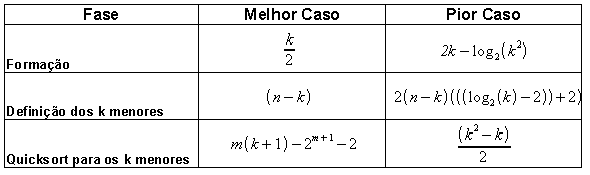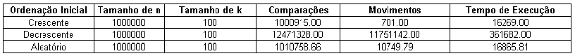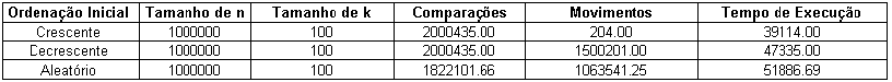 Outra situação interessante verificada na tabela 15 é que o número de movimentações de registros e comparações efetuadas pelo algoritmo executando sobre um vetor inicialmente em ordem decrescente são maiores que os do algoritmo executando sobre um vetor de ordem inicialmente aleatória. No entanto, no tempo de execução verifica-se o contrário. Isso ocorre porque mesmo efetuando mais comparações e mais movimentação de registro, o algoritmo em ordem decrescente encontra os k menores elementos primeiro. Ainda com relação a tabela 15 (assim como nos algoritmos anteriores), destaca-se que o aumento de n implica no aumento do tempo de execução.