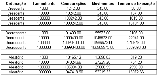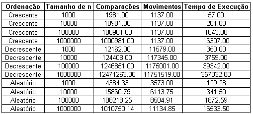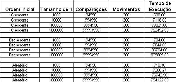 A partir da tabela 15 observa-se que os resultados das simulações com o vetor inicial em ordem crescente foram iguais em termos de comparações e amplamente divergentes em termos de movimentos de registros. Isso ocorre porque no primeiro caso, os elementos comparados um a um na primeira interação do algoritmo já se encontram em suas respectivas posições e no segundo caso, todos tem suas posições alteradas. Neste ponto, é importante destacar que após a segunda interação a disposição dos elementos é exatamente a mesma e a diferença entre os valores dos números de movimentações de registros foi dada devido a primeira interação.