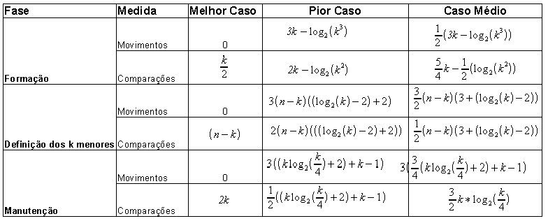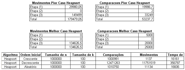 A partir da tabela 14 observa-se que os resultados das simulações com o vetor inicial em ordem crescente foram os melhores e os de ordem decrescente os piores. Esta situação se fez presente apesar do Heapsort original apresentar resultados completamente inversos. Apesar, do maior custo para montar o heap no vetor inicialmente ordenado, esta situação desfavorável é fulminantemente revertida na segunda etapa quando todos os n – k elementos restantes são maiores que a raiz do heap. Desta forma, todos são descartados. Já no vetor inicialmente em ordem decrescente, o custo para se montar o heap é mínimo, porém na segunda etapa todos os elementos pertencente aos n – k restantes são inseridos no heap (e pior, todos são folhas).
