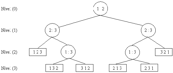 Na solução encontrada para o limite mínimo de comparações na ordenação de um vetor contendo n elementos, observou-se a criação de uma árvore binária de comparações. Essa é composta por nodos terminais, nodos intermediários e galhos. Nos primeiros, observa-se a existência de uma permutação sem repetição entre todas as combinações possíveis dos índices do vetor de elementos. Logo, conclui-se a existência de n! nodos terminais. Nos nodos intermediários, nota-se a presença de dois índices cujo elemento existente na posição indicada por cada um deles será comparado com o elemento apontado pelo outro índice. Nos galhos, verifica-se uma diferença relativa a localização dos mesmos no nodo. Os da direita indicam que a comparação realizada no nodo pai teve o elemento apontado pelo primeiro índice como sendo o maior dos dois; enquanto os localizados esquerda indicam o contrário. Destaca-se que [03] mostra a viabilidade da solução quando os dois índices existentes em um nodo intermediário apontarem para elementos de mesmo valor. A figura 01 mostra a árvore de comparação para um vetor de três elementos.