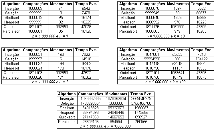 A seguir os resultados obtidos são mostrados em quatro grupos: tabelas contendo o tempo de execução e os números de comparações e de movimentos de registros de cada algoritmo com n igual a 1.000.000; tabelas comparando os resultados dos algoritmos simulados utilizando a forma aleatória e com o valor de k sendo variável; tabelas comparando os resultados dos algoritmos simulados utilizando a forma aleatória e com o valor de k sendo variável; tabelas contendo todos os resultados de cada gráfico.