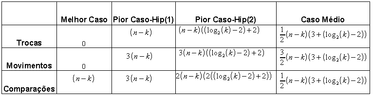 A Tabela (15) mostra alguns resultados de simulação para o algoritmo Quicksort adaptado para ordenação parcial; neste caso variou-se a ordenação inicial do vetor e o tamanho do vetor inicial (n), enquanto o número de elementos a ser ordenados (k) foi mantido constante e igual a 100. Conforme mostrado anteriormente, o melhor caso do Quicksort ocorre quando a chave particionadora é tal que o particionamento tem como resultado dois segmentos de mesmo tamanho. Da mesma forma, esta situação deve persistir nas chamadas recursiva e o particionamento de cada segmentos também deve gerar segmentos de mesmo tamanho. O pior caso, por sua vez, ocorre quando a chave particionadora escolhida é a maior chave de todas e a escolha da maior chave persiste nas chamadas recursivas. Observa-se na tabela (15-B) os números esperados para o melhor e para o pior caso. Ainda na tabela 15-B, verifica-se que os valores do melhor caso encontram-se abaixo dos valores obtidos, assim como, os do pior caso encontram-se acima dos valores obtidos.