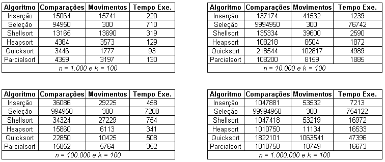 Nas tabelas (17) e (18) o presente trabalho efetua comparações entre os algoritmos simulados para ordenação parcial. O primeiro resultado observado e já mostrado por Ziviane em [07] para ordenação tradicional foi o excelente desempenho do algoritmo da Seleção para a movimentação de registros O(k), apesar de seu péssimo desempenho no número de comparações. Destaca-se ainda que entre os algoritmos implementados ele foi o que apresentou o pior tempo de execução, seguido pelo algoritmo da inserção. A exceção fica para as situações em que k = 1 e k = 2 em que eles apresentam os menores tempos de execução. Em k = 1, ambos são uma ordem de grandeza menor que os demais algoritmos.
