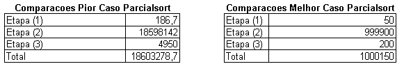 A Tabela (16) mostra alguns resultados de simulação para o algoritmo Parcialsort adaptado para ordenação parcial; neste caso variou-se a ordenação inicial do vetor e o tamanho do vetor inicial (n), enquanto o número de elementos a ser ordenados (k) foi mantido constante e igual a 100. Conforme mostrado anteriormente, o melhor caso é exatamente o mesmo do Heapsort para ordenação parcial. Logo, todas as considerações relativas aos resultados obtidos naquele são aplicadas neste algoritmo.
