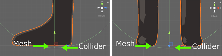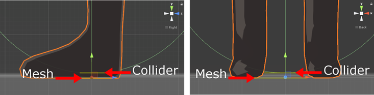 If the collider end is positioned above the mesh end, the character will get stuck when trying to move. Do not let the avatar mesh surpass the collider! The correct position is set when the bottom of the collider is at the same level or under the mesh end: