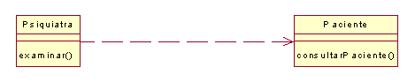 Neste exemplo, podemos dizer que Psiquiatra depende de Paciente, por dois motivos. Primeiro, a operação examinar() de Psiquiatra recebe um Paciente como argumento. Segundo, a operação examinar() chama o operação consultarPaciente() de Paciente. Se o nome ou lista de argumentos da operação consultarPaciente() mudar, você precisará atualizar o modo como Psiquiatra chama a operação. Do mesmo modo, se o nome da classe Paciente mudar, você terá de atualizar a lista de argumentos da operação examinar().