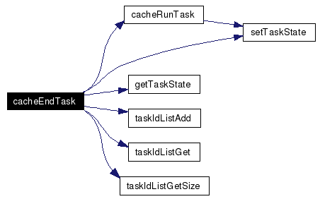 Definition at line 743 of file Cache.c. References cache, cacheRunTask(), Cache::currentTask, Cache::currentWork, _task_::dependsOnMe, E_NO_SUCH_TASK, E_TASK_NOT_RUNNING, _task_::endedTasks, finished, getTaskState(), _task_::myDeps, running, Cache::runningTasks, setTaskState(), DataSpaceId::task, taskIdListAdd(), taskIdListGet(), taskIdListGetSize(), Cache::tasks, Cache::terminatedTasks, and DataSpaceId::work. Referenced by dsEndTask(), and dsReadBuffer(). Here is the call graph for this function: ![]() |