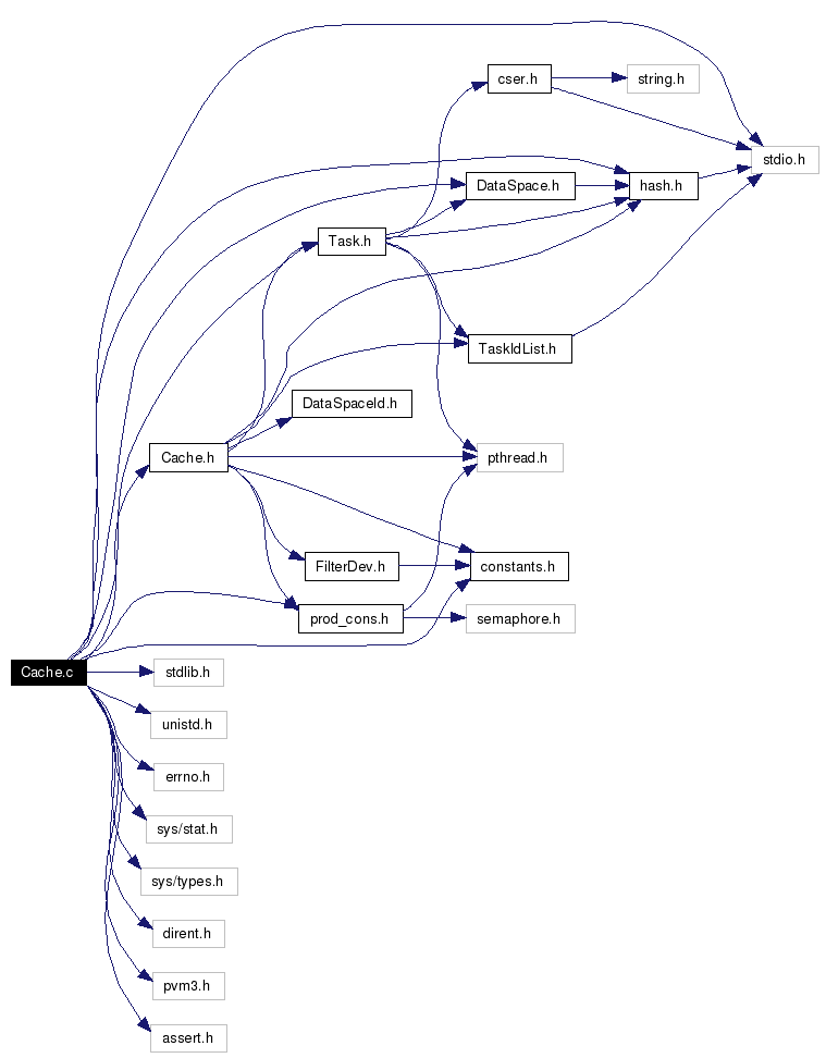 #include <stdio.h>#include <stdlib.h>#include <unistd.h>#include <errno.h>#include <sys/stat.h>#include <sys/types.h>#include <dirent.h>#include <pvm3.h>#include <assert.h>#include "Cache.h"#include "constants.h"#include "DataSpace.h"#include "Task.h"#include "prod_cons.h"#include "hash.h"Include dependency graph for Cache.c: