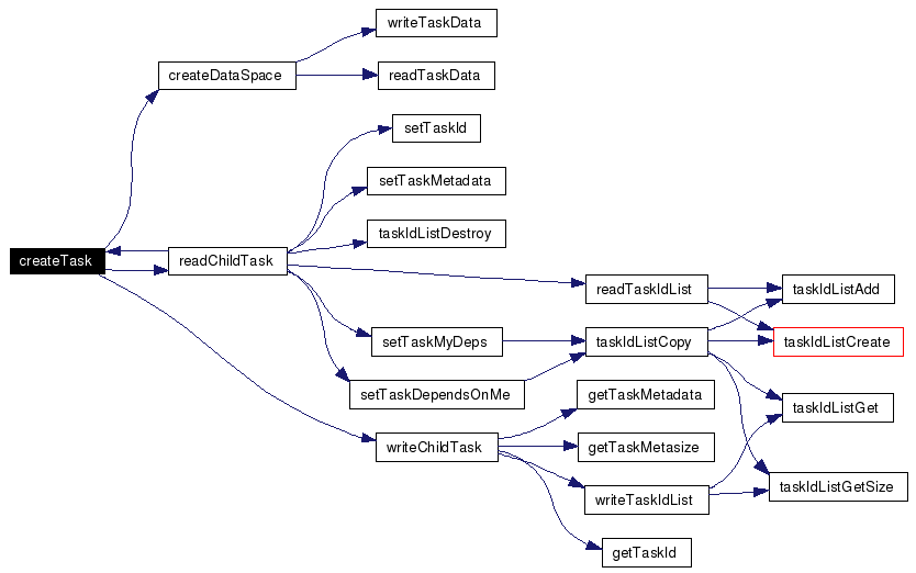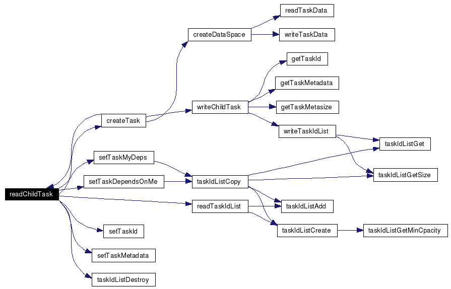 Definition at line 341 of file Task.c. References createTask(), READ_BEGIN, READ_BYTES, READ_END, READ_NUM, readTaskIdList(), setTaskDependsOnMe(), setTaskId(), setTaskMetadata(), setTaskMyDeps(), and taskIdListDestroy(). Referenced by createTask(). Here is the call graph for this function: ![]() |