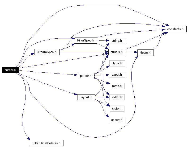 #include "parser.h"#include "structs.h"#include "constants.h"#include "FilterSpec.h"#include "StreamSpec.h"#include "Layout.h"#include "FilterData/Policies.h"#include "Hosts.h"Include dependency graph for parser.c: