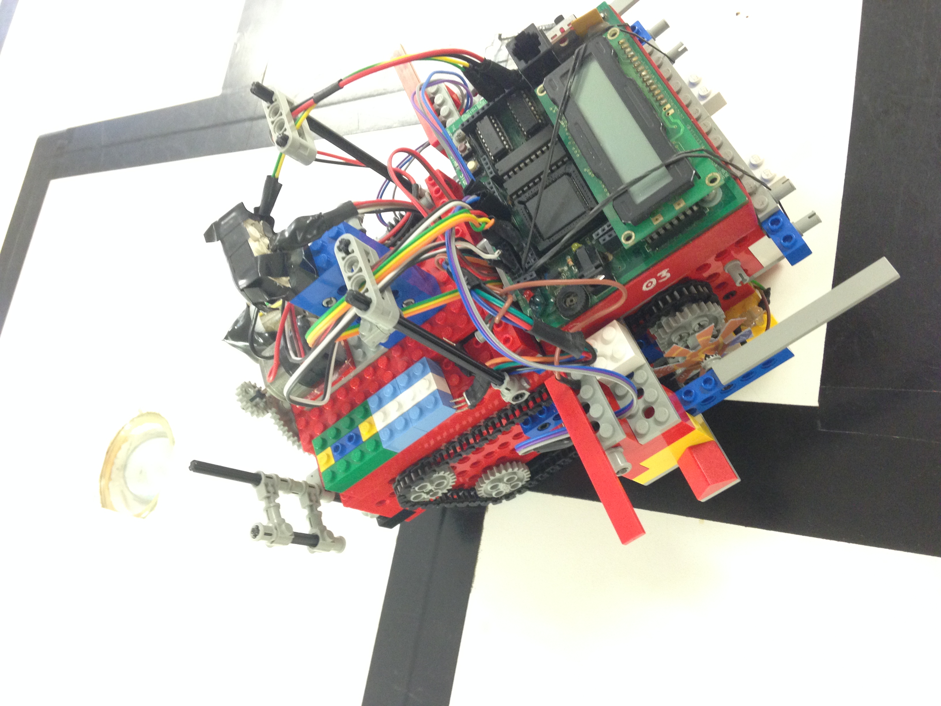 Toda sistema de locomoção se encontra na parte traseira do robô. Isto inclui o sistema de diferenciais duplos, reduções com engrenagens, e motores. Já a parte da frente foi destinado ao posicionamento de sensores de locomoção, identificação de luz polarizada, identificação de cor, breakbeams, e handyboard. Como não havia um peça fina o suficiente para ser utilizado no breakbeam, foi utilizado dois discos furados, cortados de um cartão telefônico. O sensores utilizados para seguimento de linha são dois ldr's setados para fornecer um input digital. Um led de luz foi adicionado para melhorar a precisão da leitura da linha pelos sensores. Para realizar a leitura da luz polarizada foi construido um “torre” de lego com dois sensores ldr's. Estes sensores tem cada um um filtro de polarização posicionado na frente. Cada filtro foi alinhado com a luz de uma lampada que se encontra na mesa de testes.