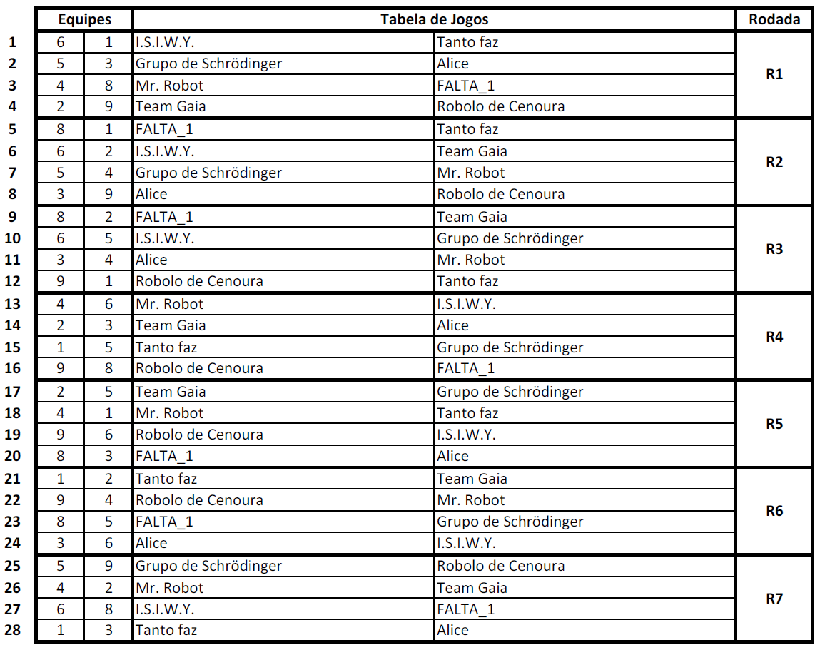 A competição será realizada no formato todos contra todos, e o robô que obtiver a maior pontuação ao final será declarado o grande vencedor da competição de Introdução à Robótica 2016/1. Abaixo a tabela dos jogos.