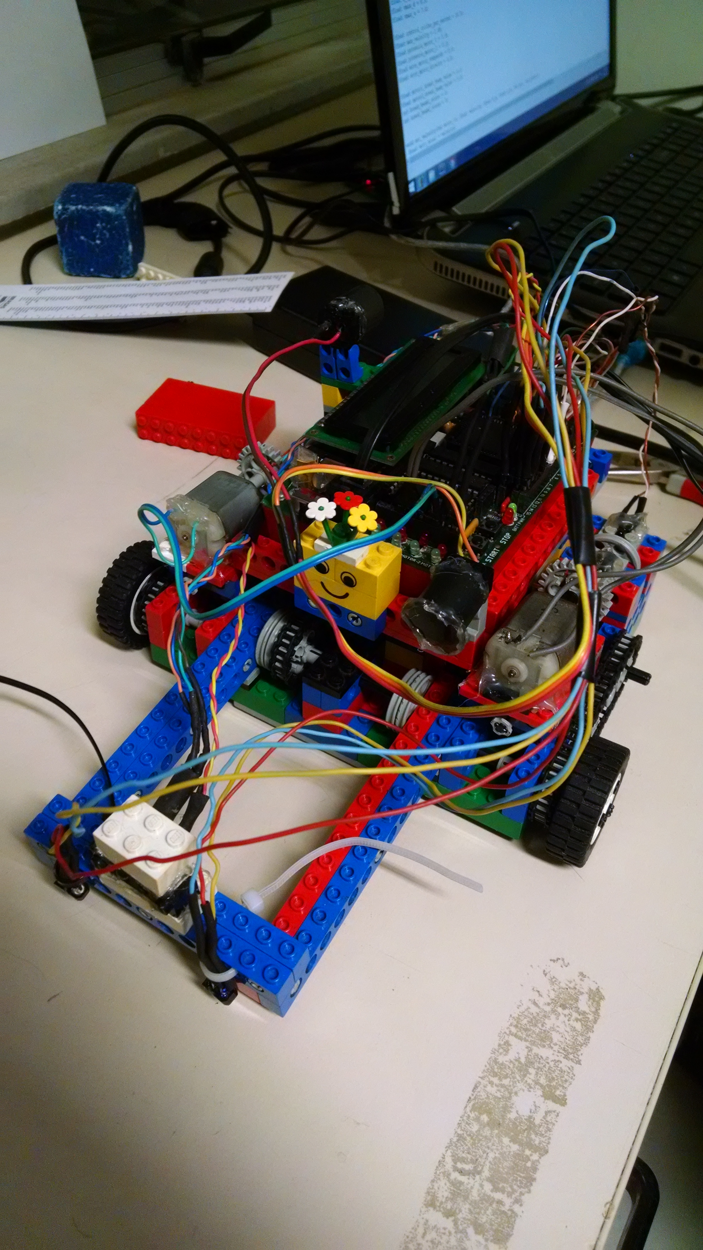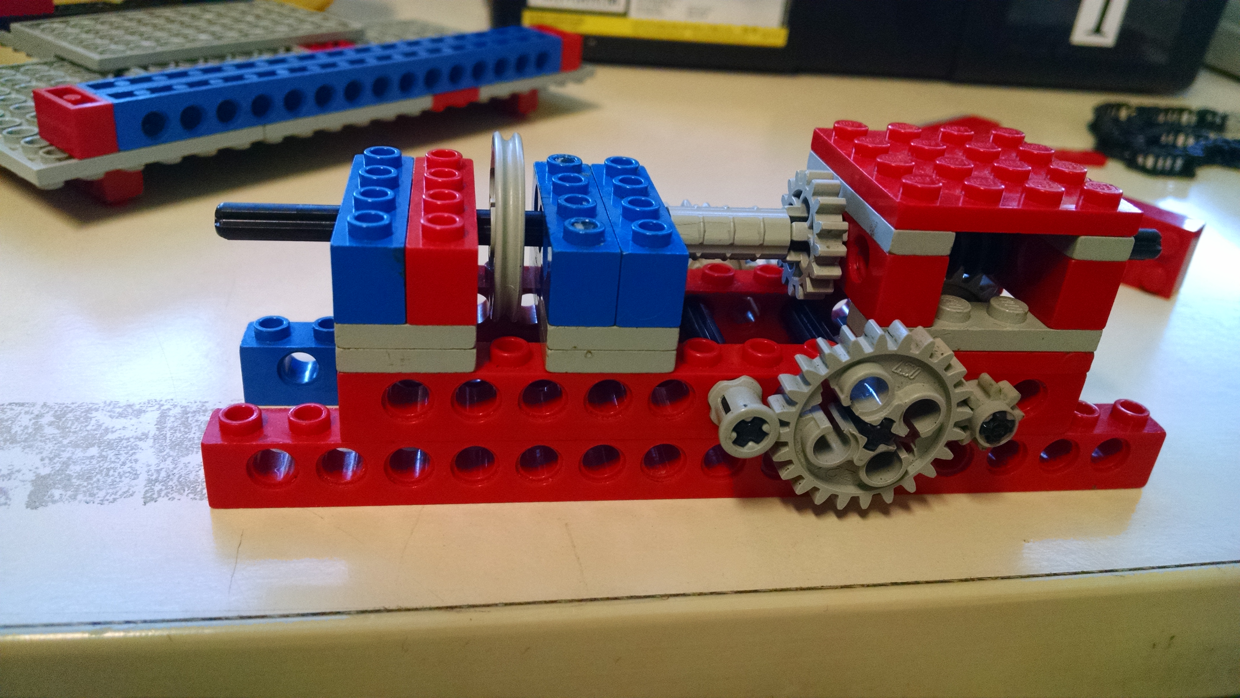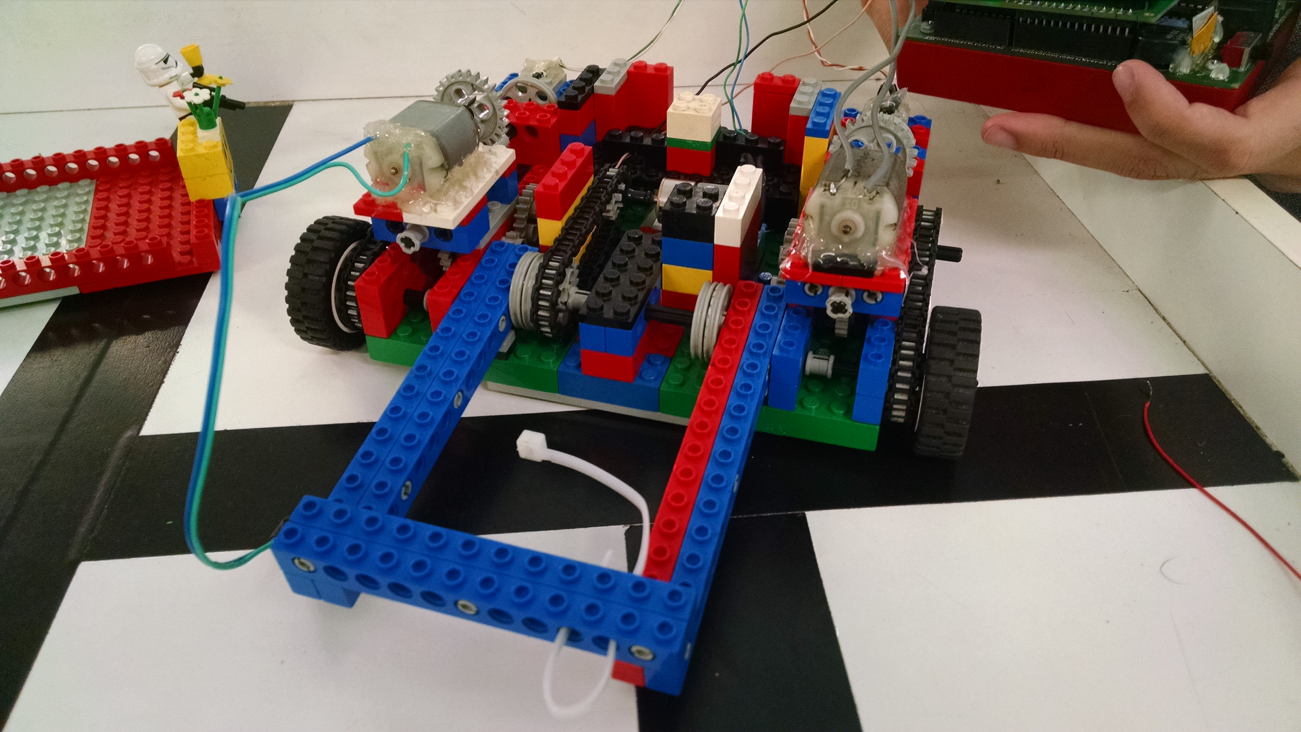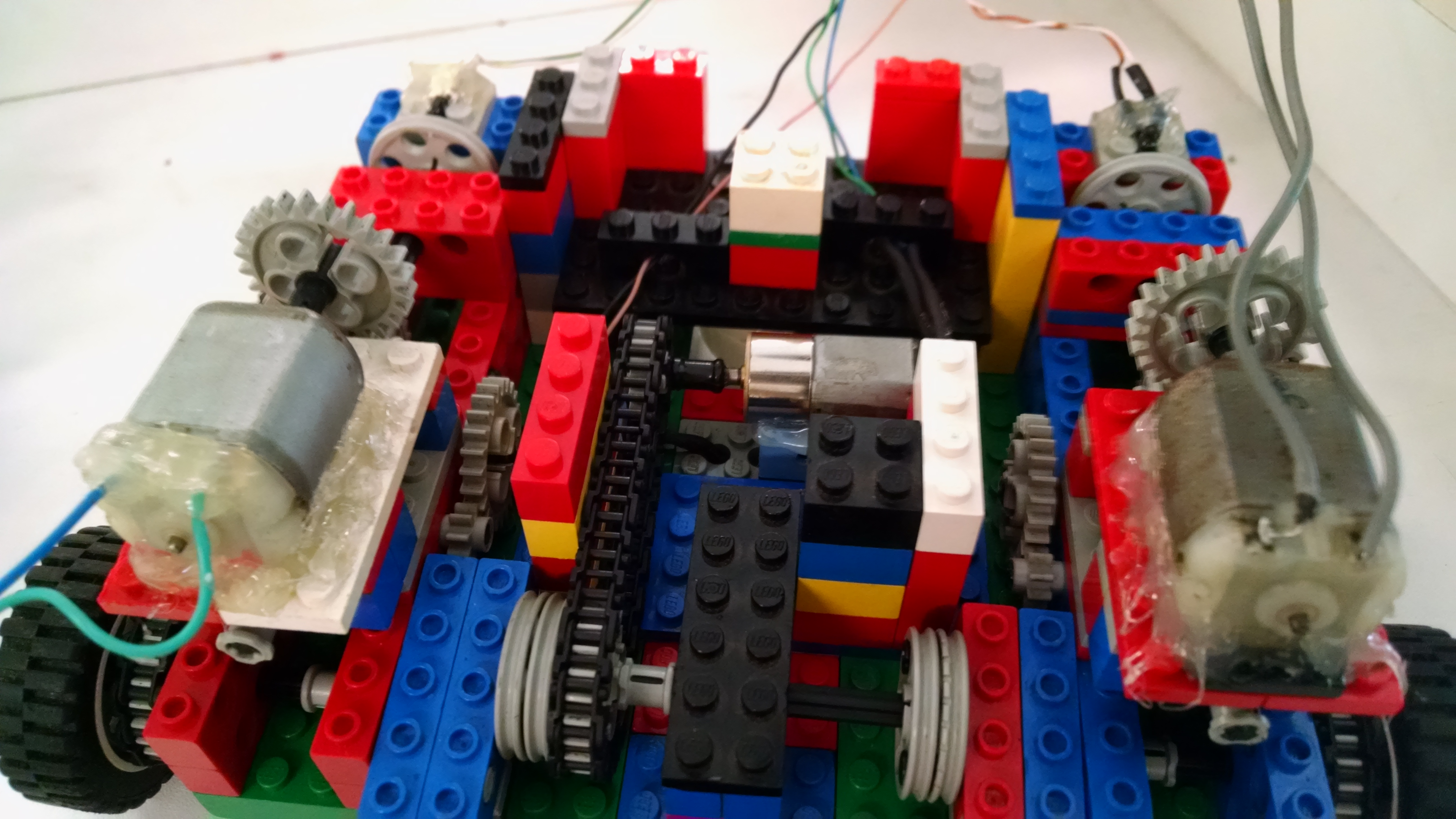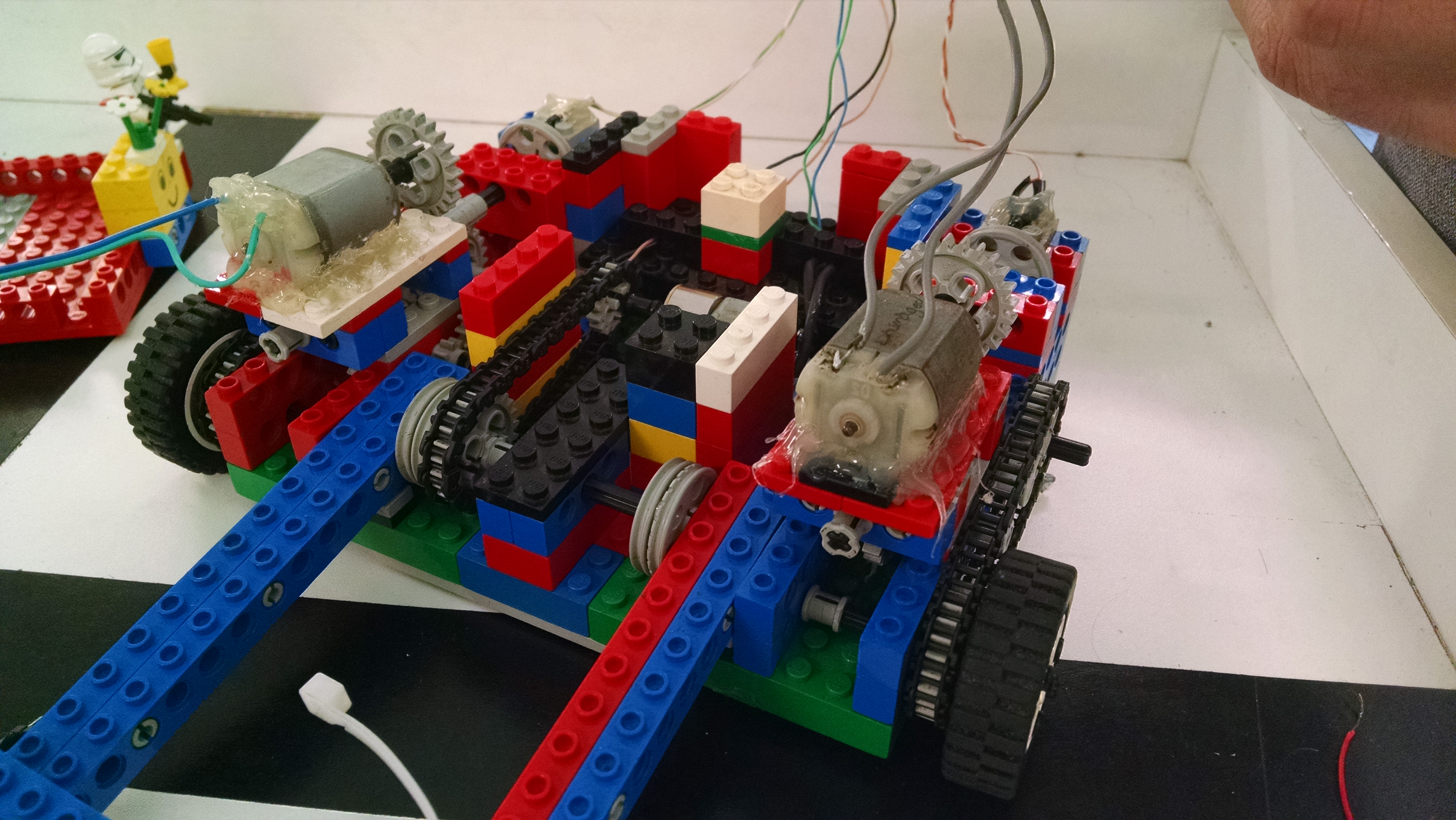 Como pode-se ver pelas imagens, os motores ficaram acima das caixas de redução, sendo que na frente deles foram afixados os break-beans. No meio, colocamos um motor adicional, ligado por uma corrente ao mecanismo de captura de blocos, uma cancela. Esse motor adicional levantaria e abaixaria a cancela, capturando um bloco. A imagem abaixo mostra a montagem final do robô.