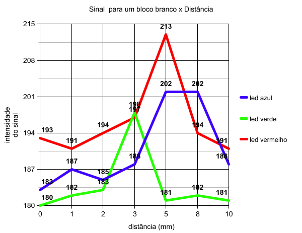 O sensor funciona de forma mais eficiente a uma distância média de 0,5 cm da superfície do objeto, com um valor de sinal esperado para os leds vermelho, verde e azul de respectivamente: 209 ±5, 192 ±5, 199 ±6. Observa-se que o sensor é mais sensível ao vermelho e menos sensível ao verde, enquanto o azul está flutuando no meio. Isto deve ser levado em consideração quando os valores forem lidos para os três leds.