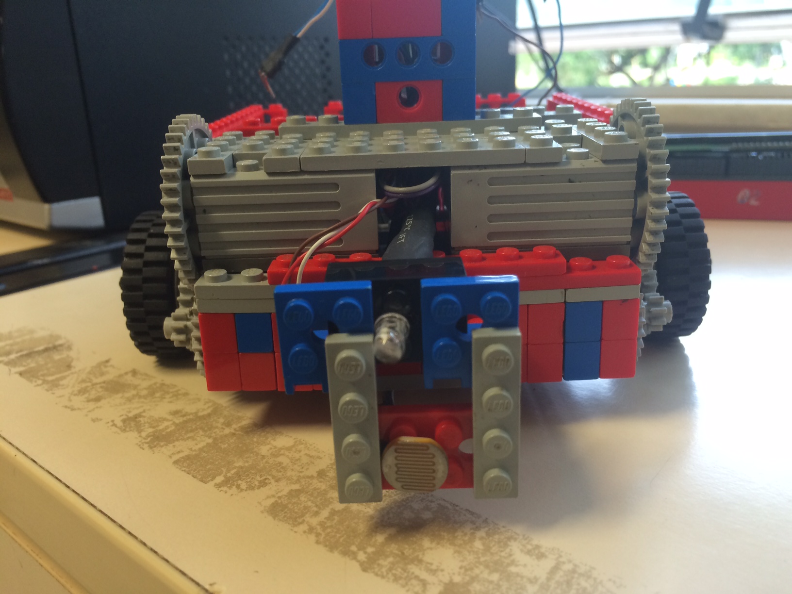 Optamos por utilizar um sensor baseado em LDR na frente do robô, adicionando uma pequena estrutura para sustentar a peça e dois sensores óptico-reflexivos na parte de baixo do robô, próximos ao eixo apontados para baixo.