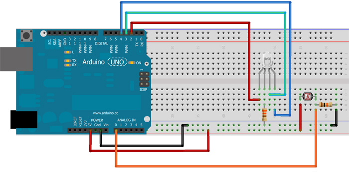 O grupo optou por usar um LED RGB em associação ao LDR, segundo a montagem abaixo como referência :