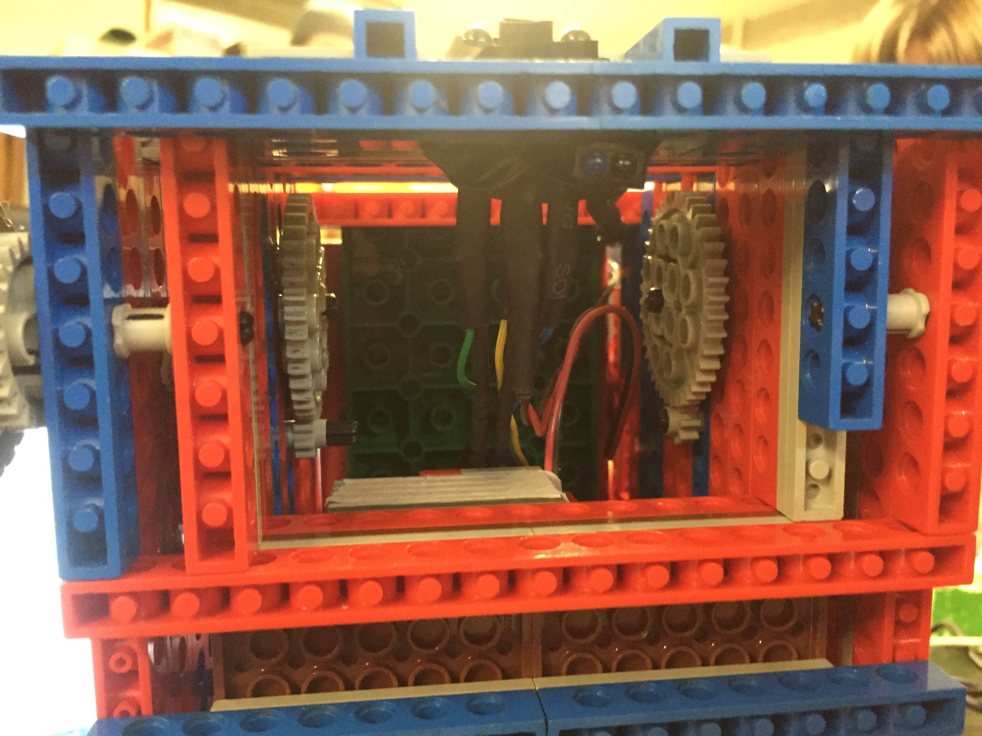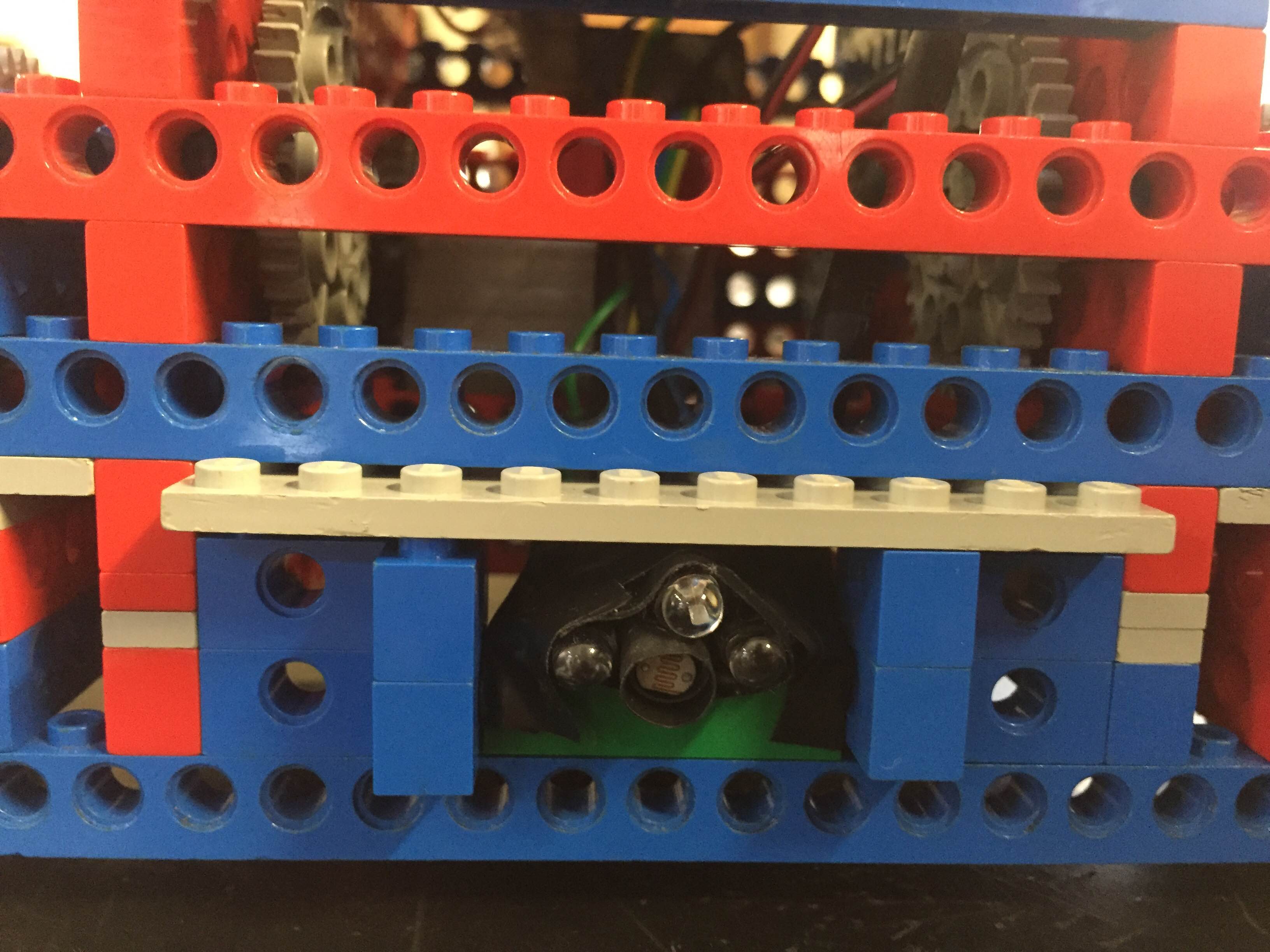 Depois começamos as instalações dos sensores que seriam utilizados. Os LEDs e o LDR foram instalados na parte dianteira inferior do robô para a identificação das cores dos blocos. O termo retrátil foi utilizado como aparato para evitar ao máximo que a luz ambiente interferisse na leitura do sensor.