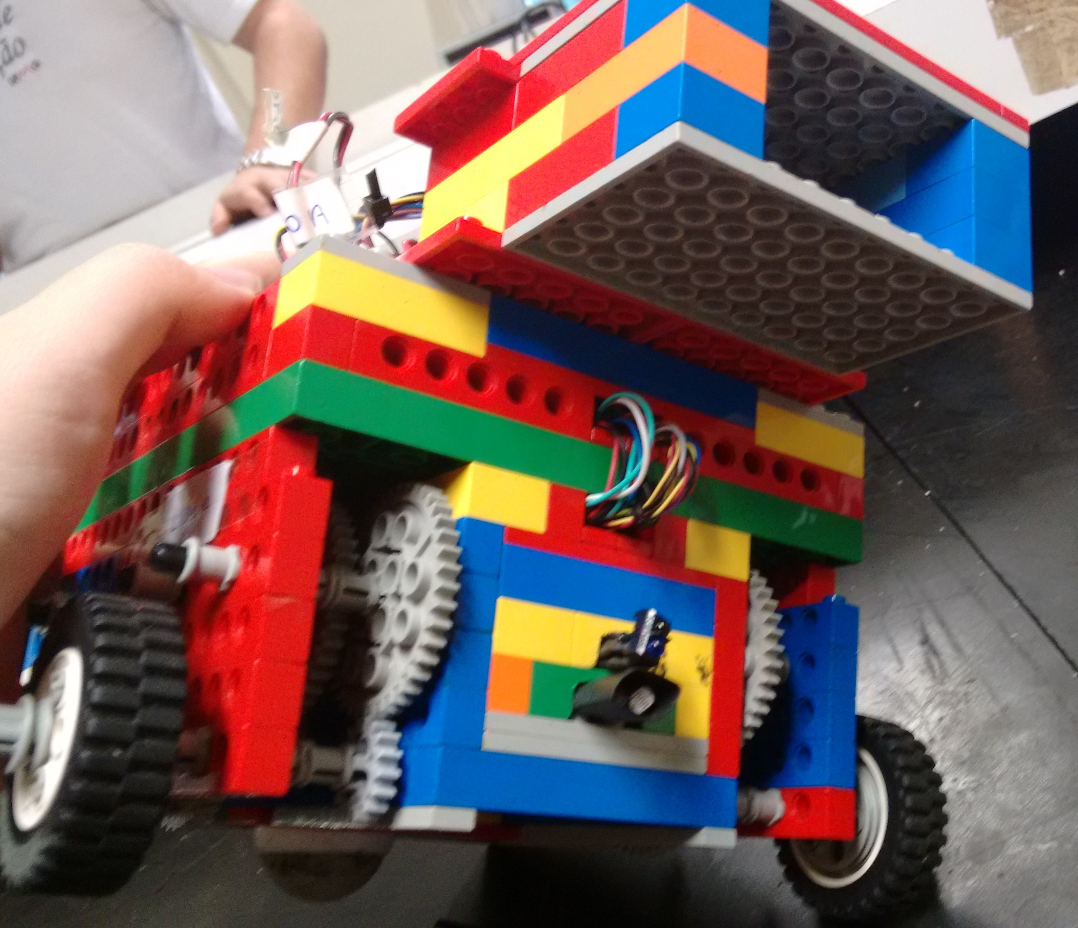 Para a tarefa de alinhamento do robô com as fontes de luz, dois sensores LDR foram instalados com filtros polarizados, de forma a atuar como um LDR diferencial. Os sensores foram inseridos no interior de uma caixa feita de lego na parte superior do robô, a fim de diminuir a influência da luz ambiente na leitura.