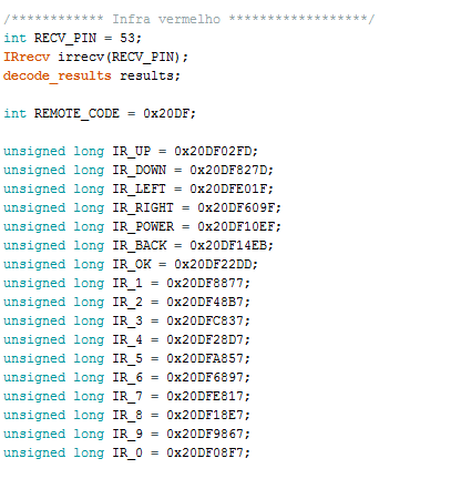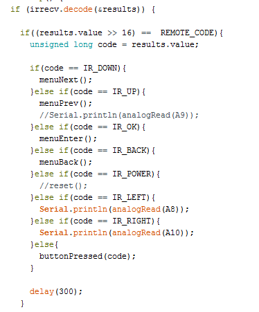 Uma das decisões de implementação da equipe neste projeto foi o uso de controle remoto de emissão de infravermelho, comumente usados em televisores, para a navegação e ajustes no menu. Um controle remoto emite sinais infravermelho codificados de maneira que cada botão emite um código de 4 bytes distinto, desta forma, usando um sensor infravermelho, para detectar os botões pressionados no controle, bastar detectar o código enviado pelo mesmo. Nós utilizamos a biblioteca Arduino IRRemote disponibilizada pelo usuário z3t0 no GitHub (disponível em: http://z3t0.github.io/Arduino-IRremote/) para detectar o código enviado pelo controle, deste modo a programação era reduzida a mapear os botões do controle usado, e assim que o código fosse detectado, executar as funções de navegação do menu.