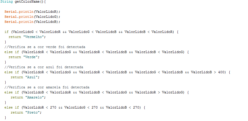 A rotina de determinação de cores foi encontrada após alguns testes para se ter uma ideia do valor do sinal encontrado em cada cor. Assim notou-se que as cores seguiam a seguinte lógica: