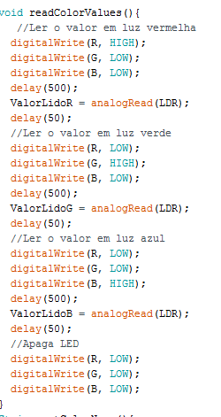 Utilizando a placa com o LED RGB e o LDR,. a programação da detecção de cores foi feita em basicamente dois passos: