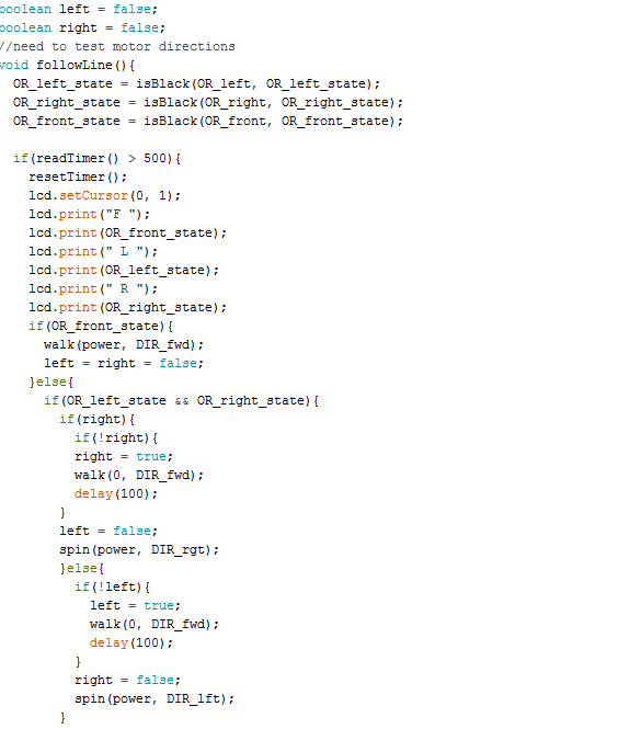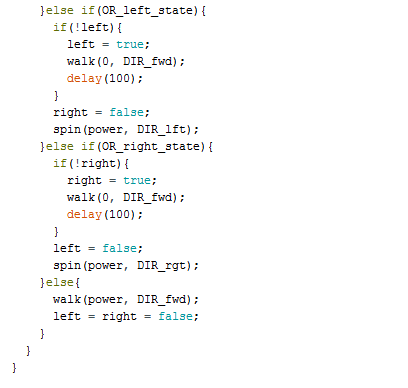 - Caso o contrário, os sensores laterais eram consultados, caso o da esquerda estivesse na linha, o robô girava em seu próprio eixo para a direita