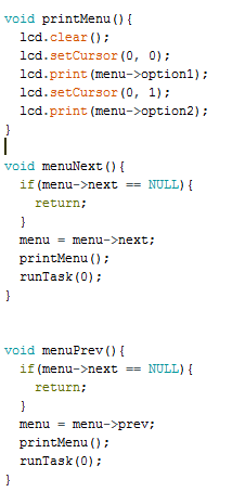 Option1 option2 contém as strings a serem exibidas na primeira e segunda linha respectivamente. Os ponteiros next e prev apontam para o MenuOpt a ser exibido ao navegar para frente e para traz no menu. Já os ponteiros enter e back apontam para o MenuOpt a ser exibido quando a tecla enter e back são pressionadas, respectivamente, caso aja algum submenu presente. As funções de navegação agora apenas atualiza o ponteiro para o MenuOpt atual. No caso da função menuEnter, como a tecla de ativação da opção é a mesma para entrar no submenu, caso o ponteiro enter for nulo na opção atual, a função executa a tarefa da opção atual do menu.