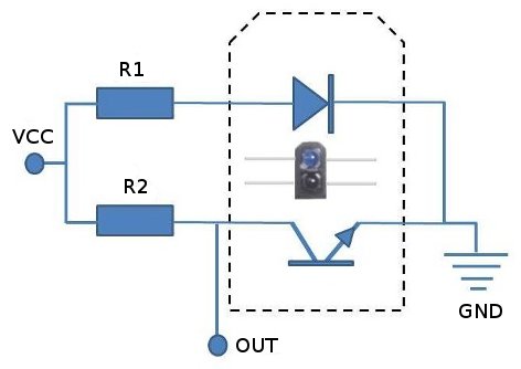 Utilizamos o sensor óptico TRCT5000, esse possui um LED emissor de infravermelho e um fototransistor. De acordo com seu datasheet temos que a distância de operação com eficiência maior que 20% é de 0.2mm até 15mm. Utilizamos um resistor R1 de 300Ω e em R2 um de 10KΩ. O OUT foi ligado a uma porta analógica. E o VCC é a voltagem do Arduíno, 5V.