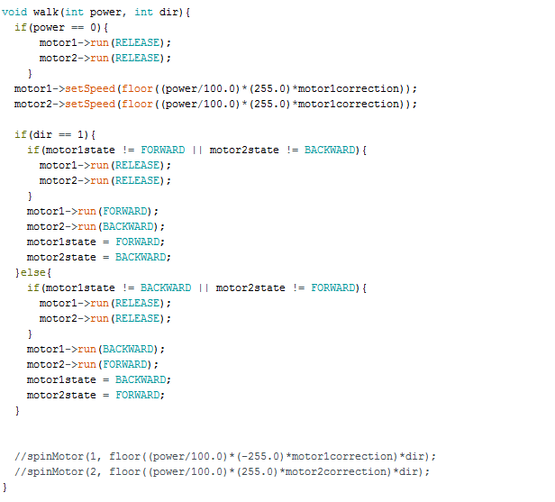 Com o novo shield de controle dos motores, o código de movimentação criado no ultimo TP foi alterado pra se adequar a sintaxe na nova biblioteca de movimentação. O as funções mantiveram sua assinatura e resultado esperado, mas sua implementação interna foi alterada. O shield dos motores utiliza a biblioteca Adafruit_Motor_Shield_V2 disponibilizado pelo professor para nosso grupo. A nova biblioteca tornou a programação de giro dos motores mais simples, onde era necessário apenas setar a velocidade do motor com um método e a direção de giro com outro.