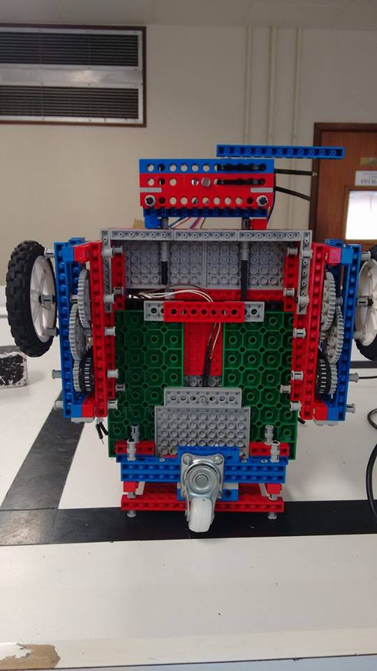 O robô deveria coletar blocos, identificar suas cores e levá-los até a base, desde que não fossem coloridos de preto. Como a estratégia foi passar por cima do maior número de blocos possíveis e arrastá-los até a base, reconstruimos o robô aumentando suas dimensões, suspendendo a base e abrindo um espaço interior para conter os blocos, como mostra a figura abaixo: