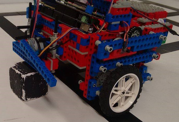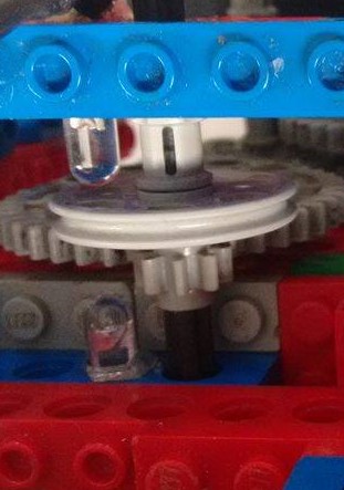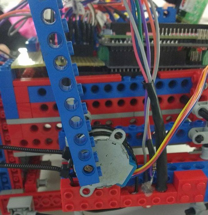 Um quarto ponto crítico foi a detecção de cores e nossa estratégia para não passar por cima dos blocos pretos. Nesse caso, um para-choque dianteiro suspenso foi instalado e nele havia um detector de cores LDR e um motor de passo. O carro detectava as cores daquilo que ele passava por cima e, caso fosse preta, ele retirava a peça da frente girando o motor de passo. Assim, apenas blocos coloridos passavam por baixo sem ser removidos e o carro poderia seguir seu rumo pré-programado a tempo de coletar vários blocos e voltar para a base em sessenta segundos. O motor de passo será detalhado em seguida.