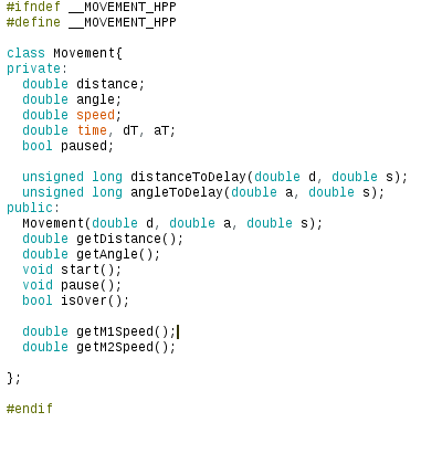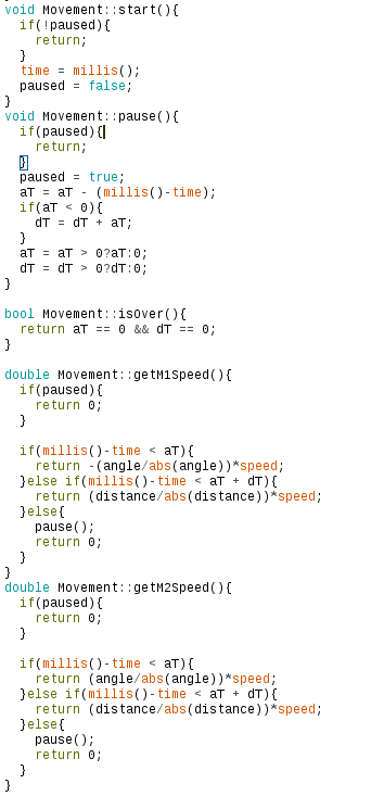 Os métodos principais da classe são o pause() e start(), que pausam e iniciam/retomam o movimento do ponto onde ele foi interrompido, e o getM1Speed()/getM2Speed(), que retornam a velocidade a ser aplicada em cada motor respectivamente.
