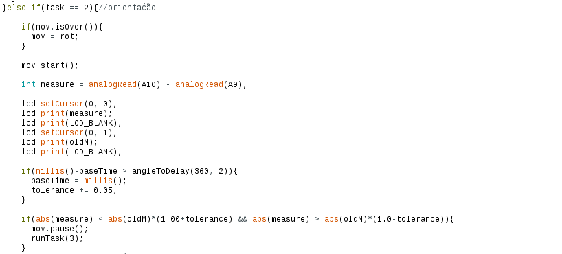 Nós acrescentamos também um passo de calibração do alinhamento, onde o carro é colocado na luz de partida, alinhado com a luz polarizada, e é feito uma leitura que é usada como referencia para o alinhamento. A rotina de alinhamento então se tornou girar o robô no próprio eixo e procurar uma leitura similar à da calibração.