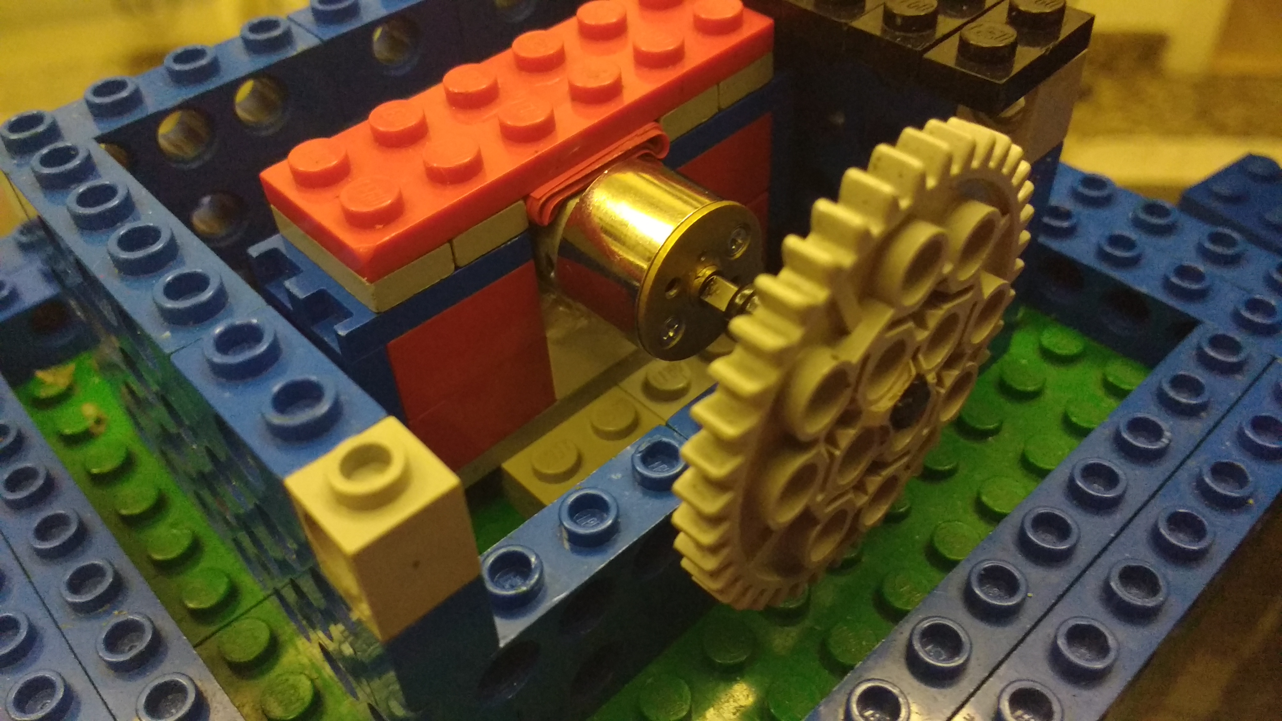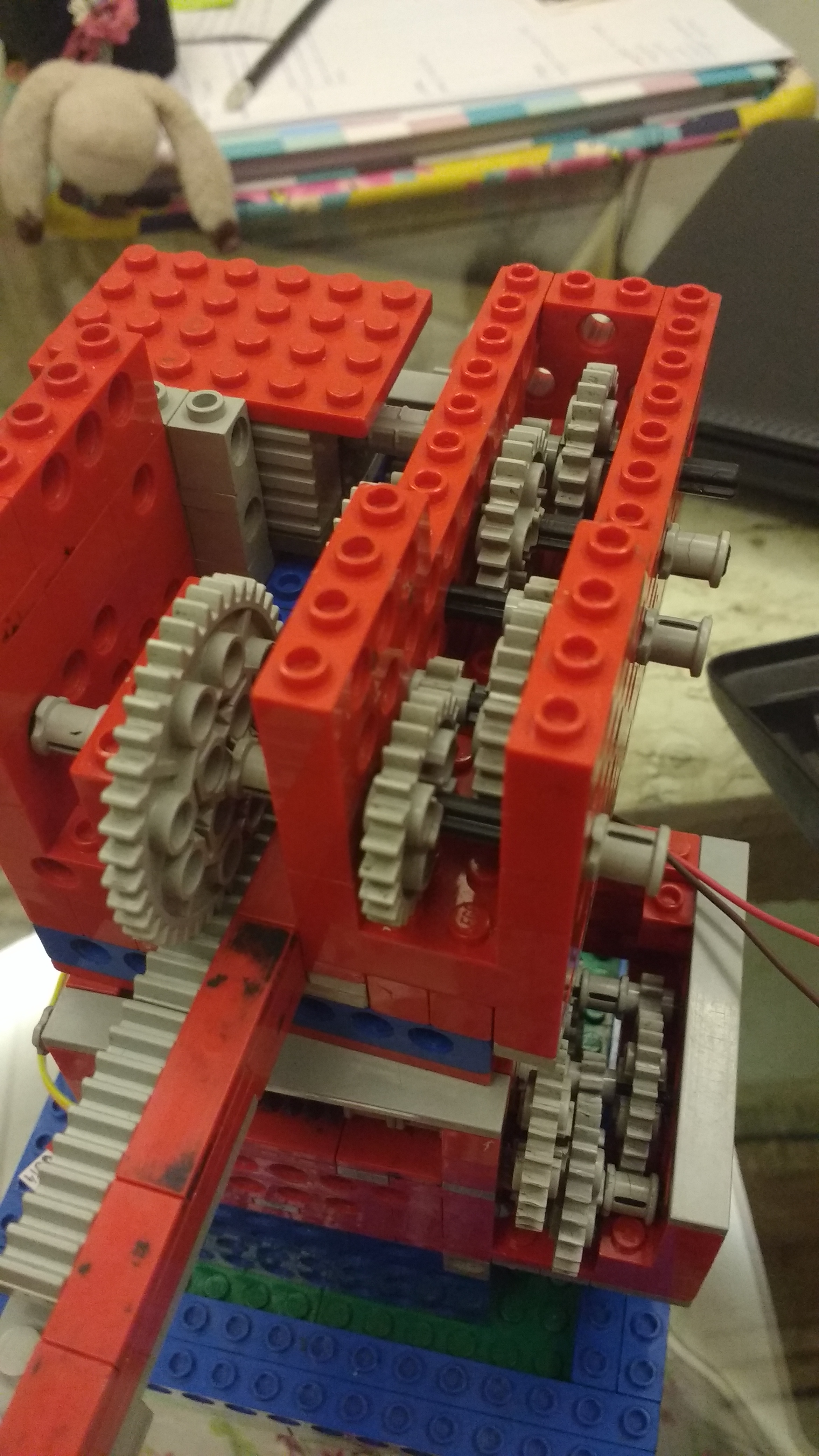 A parte de baixo ficou responsável pela rotação da parte superior da estrutura utilizando um eixo em parafuso para girar uma engrenagem e transferir a rotação de um eixo horizontal para um vertical. Essa conexão porém, não ficou perfeita. Na verdade, havia uma folga entre o eixo e a engrenagem que permitia que por um pequeno espaço de tempo, um dos dois girasse sem acionar o outro. Essa folga persistiu e uma das maiores dificuldades encontradas, visto que ela parecia impedir a perfeita sincronização dos dois movimentos.
