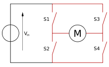 A Ponte H, foi utilizada para permitir que, após ligado na bateria, fosse possível inverter a polaridade dos motores e assim girá-los para os dois sentidos. Isso é feito ligando cada vez um dos lados de um motor como na figura.