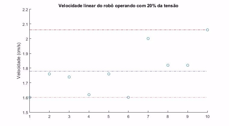 Foram realizados alguns testes para modelar o funcionamento do motor, tendo em vista que o controle do funcionamento dele é em malha aberta, ou seja, não envolve o uso de sensores. Para medir a velocidade linear de movimentação do robô a determinadas tensões, foram medidas as distâncias percorridas em 5 segundos para o motor funcionando a 20% da potencia máxima e a 50% da potência máxima.