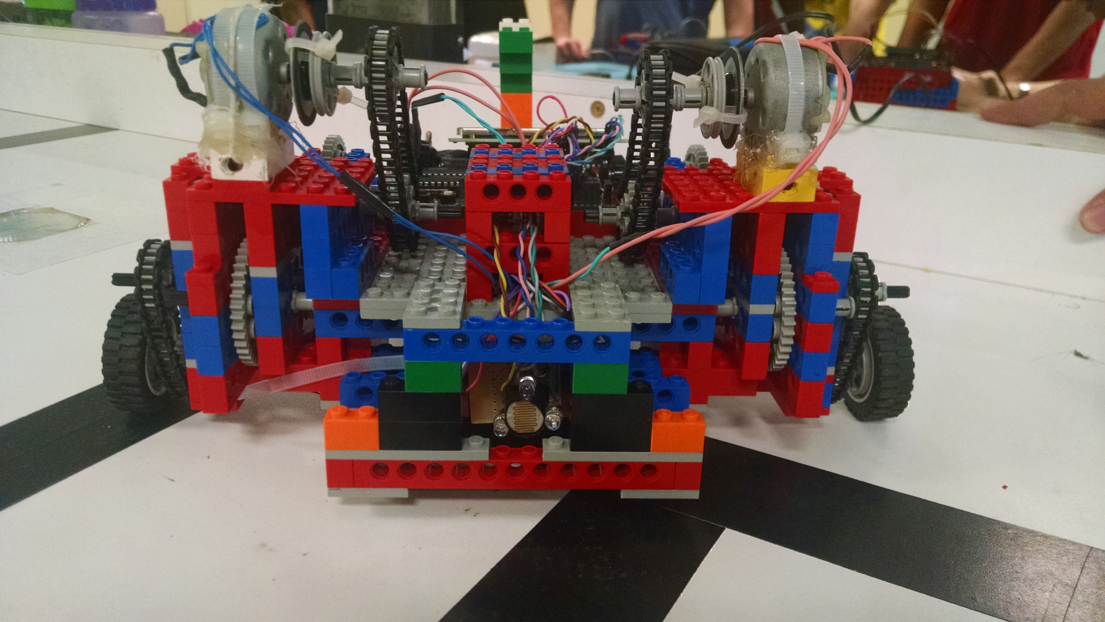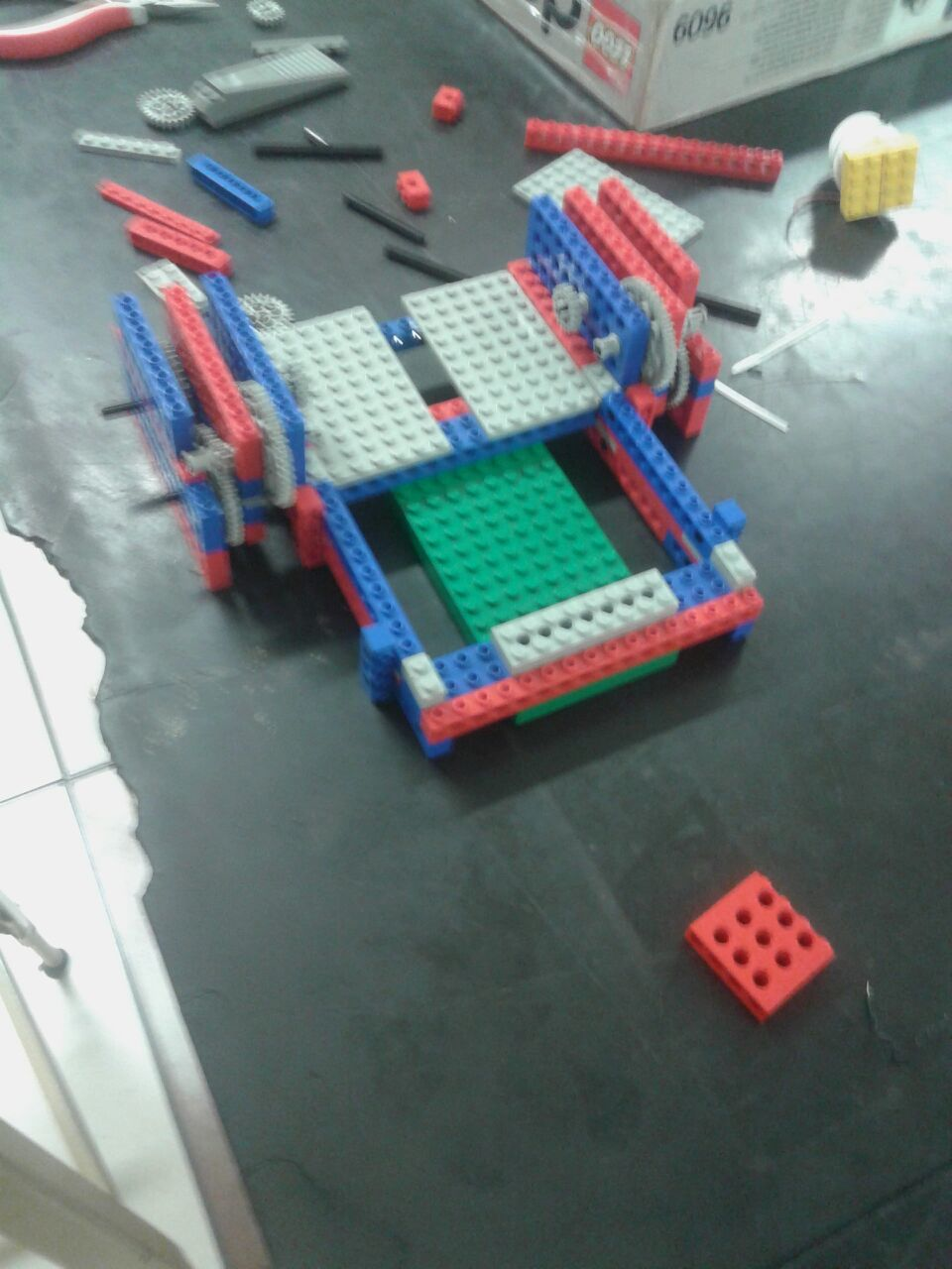 - Posicionamento da HandyBoard na estrutura: destacamos este erro, pois focamos fortemente a estrutura do robô e demos pouca atenção ao tamanho da Handyboard, cujo posicionamento, por isso, foi um pouco improvisado e geraria muitos problemas caso o robô se movimentasse.