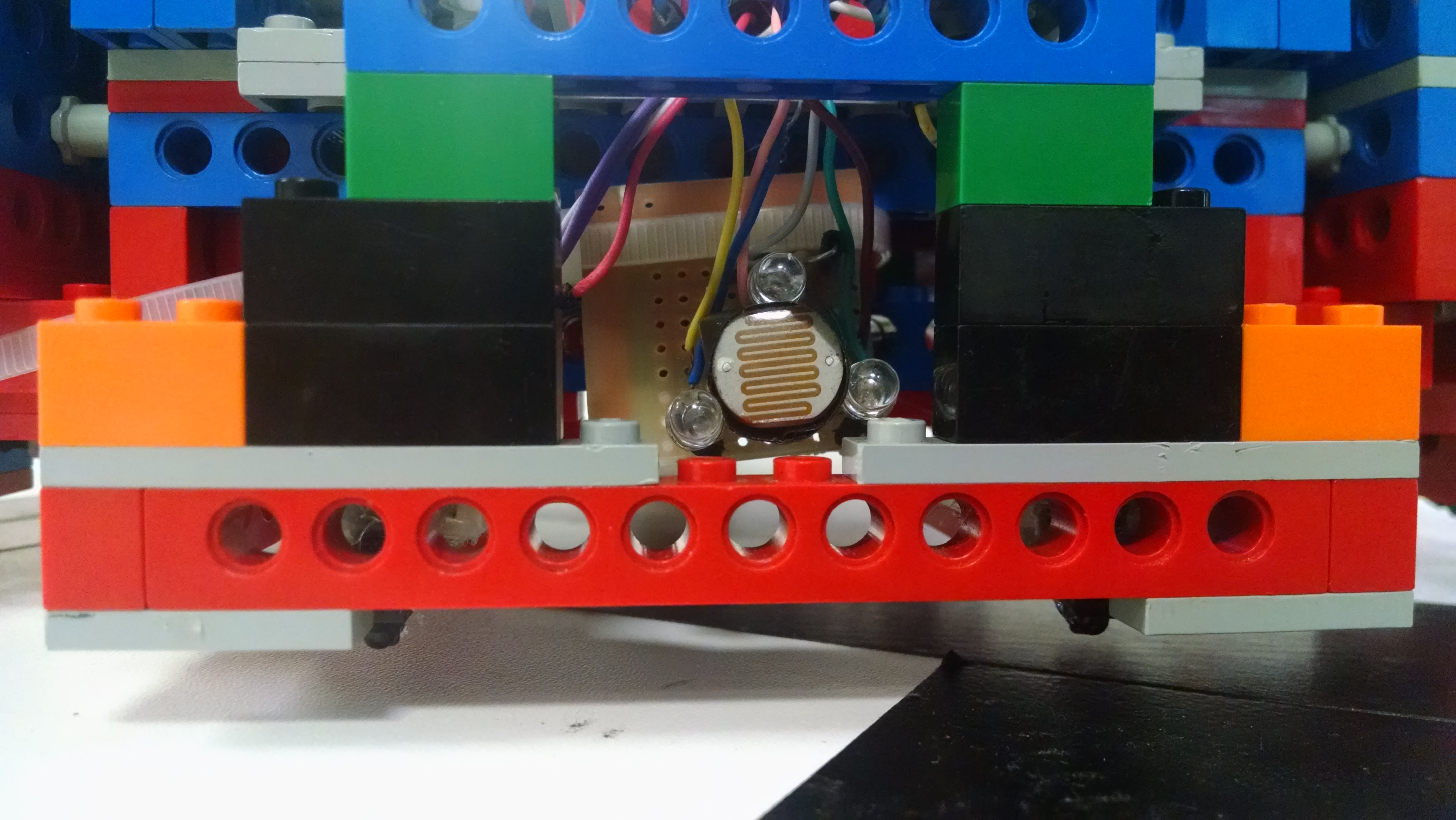 - O sensor LDR com LEDs na parte frontal do robô, construído na etapa anterior, foi mantido