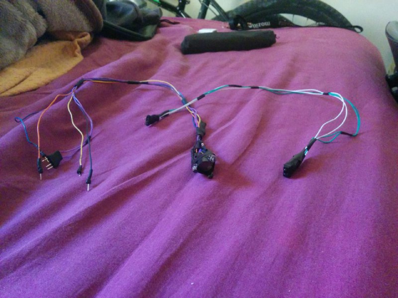 Para o sensor de cor, foi preciso montar nosso próprio sensor, utilizando três LEDs monocromáticos (um vermelho, um verde e um azul) e um LDR. Primeiro, o LDR é protegido com fita isolante para que a luz dos LEDs não atinja diretamente o LDR e interfira com as leituras. Depois, os três LEDs são colados ao redor do LDR, de forma que, quando ligados, a luz refletirá no bloco à frente do sensor e atingirá o LDR. Como os LEDs são de 3V e as saídas digitais no HandyBoard são de 5V, foi necessário usar resistências de 220Ω para controlar a corrente nos LEDs e prevenir mal-funcionamento.