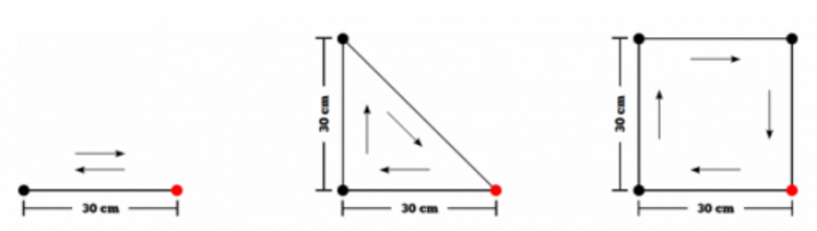 No primeiro trajeto, o robô deve seguir uma linha reta horizontal de 30cm, virar 360º, e retornar ao ponto de início. O segundo trajeto consiste em um triângulo retângulo de 30cm e o terceiro em um quadrado, também de lado 30cm. Os percursos foram feitos empiricamente, ou seja, testando-se simultaneamente parâmetros de programação (potência de cada motor + tempo em que ficaria ligado) e distâncias efetivamente percorridas. Como não conseguimos, em tempo hábil, motores de 9V (o recomendado para o TP, pois a tensão de saída da HandyBoard (HB) era de 9V) utilizamos motores de 12V. Em teoria, usar motores de tensão superior acarretaria em perda de potência dos mesmos, todavia nos testes viu-se que esta perda era desprezível e não interferia na locomoção do robô (já que o torque exigido não era alto). Uma caixa de redução também foi utilizada de modo a termos um maior controle sobre a distância que o robô andaria. Ela foi feita de verticalmente para diminuir o comprimento do robô, facilitando a distribuição de massa sobre os pontos de apoio (rodas).
