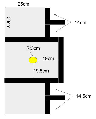 Utilizando o esquema da competição, foi analisado da seguinte formas, as medidas, a base possui a parte central e duas laterais, esquerda e direita. Também foi medido a plataforma superior atrás da base, os blocos e própria base. As medidas são: