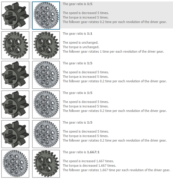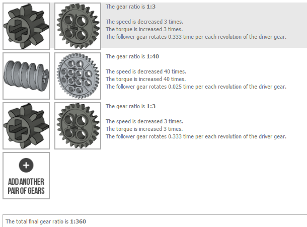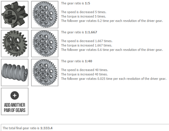 O robô anterior possui um conjunto de 11 engrenagens que combinadas geram uma redução segundo o site lego gear ratio de 1:374.925, ou de 375 voltas do motor. O torque é a força multiplicado pelo raio da roda de 4,1cm = 6,273N.cm. Com isso os dados que obtemos são: