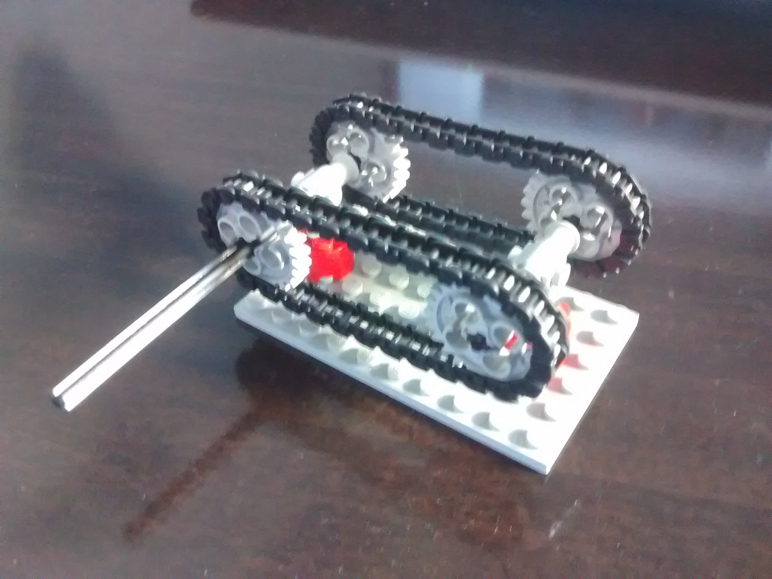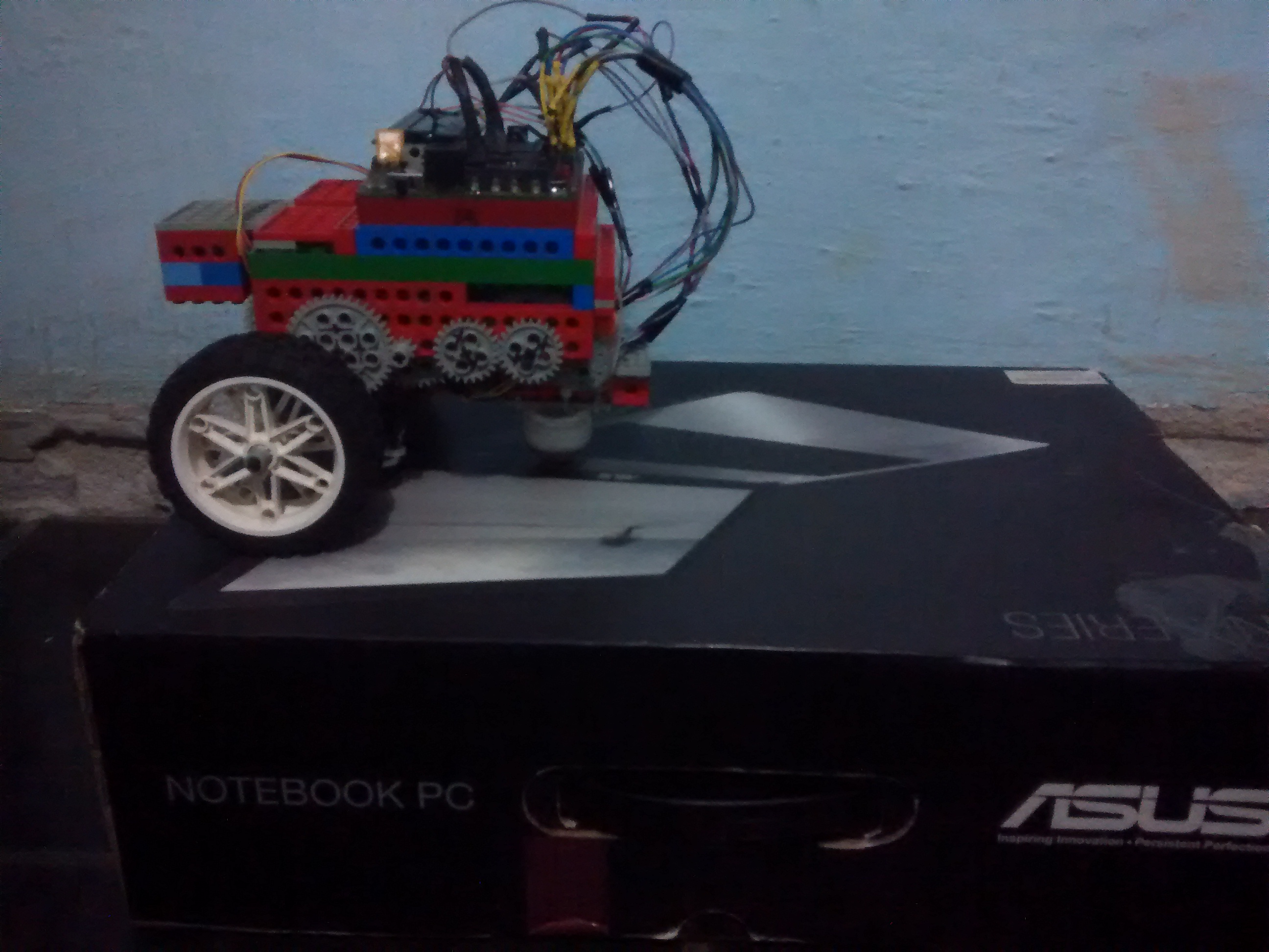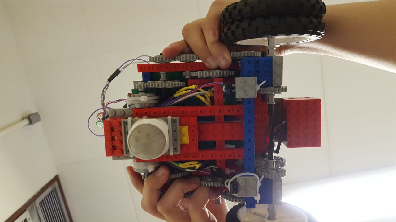 Em um teste isolado demonstrado nesta foto foi observado que o bloco não subiria pela esteira, pois a mesma não possui uma superfície atritante que force o bloco a ser empurrado, então ou se diminui a inclinação da rampa, ou se instala mais esteiras na parte superior e lateral, além de algumas engrenagens com blocos para “forçar” uma subida com apoio, embora dentro do robô deve haver espaço livre o suficiente para o bloco saltar caso fique preso e não ser destruído.