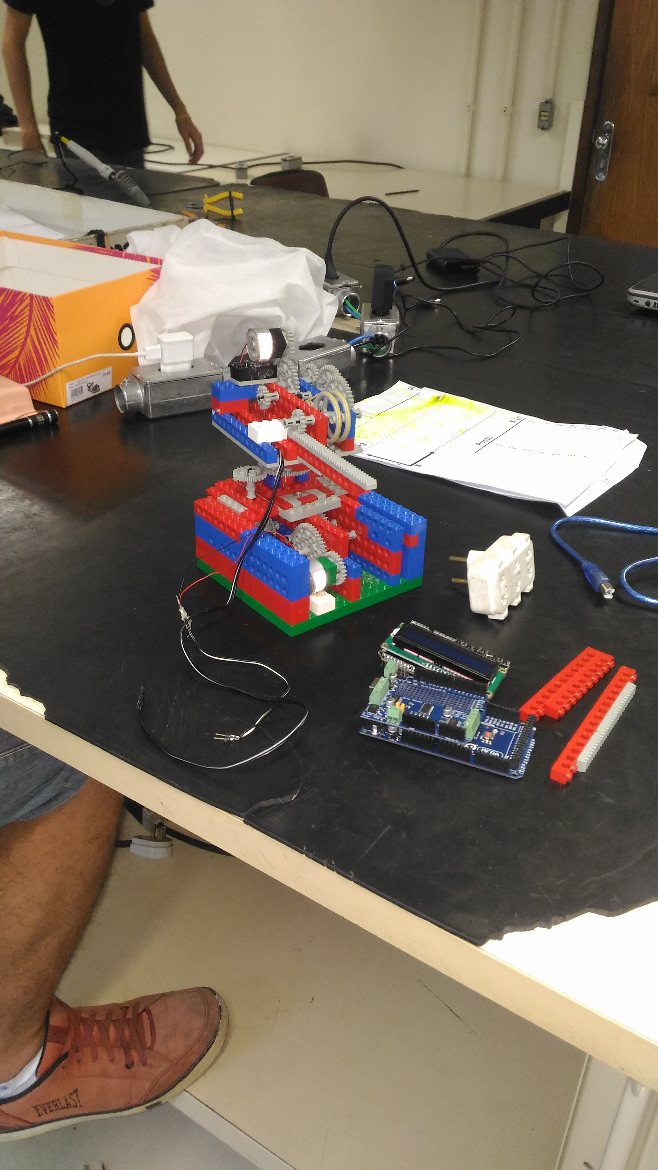 Na imagem acima podemos ver o robô completo, onde a única alteração para o produto final foram as diferentes versões do efetuador, que sempre foi estruturado como uma caixa de LEGO, com o quais tivemos diversos problemas que serão abordados na seção de testes.