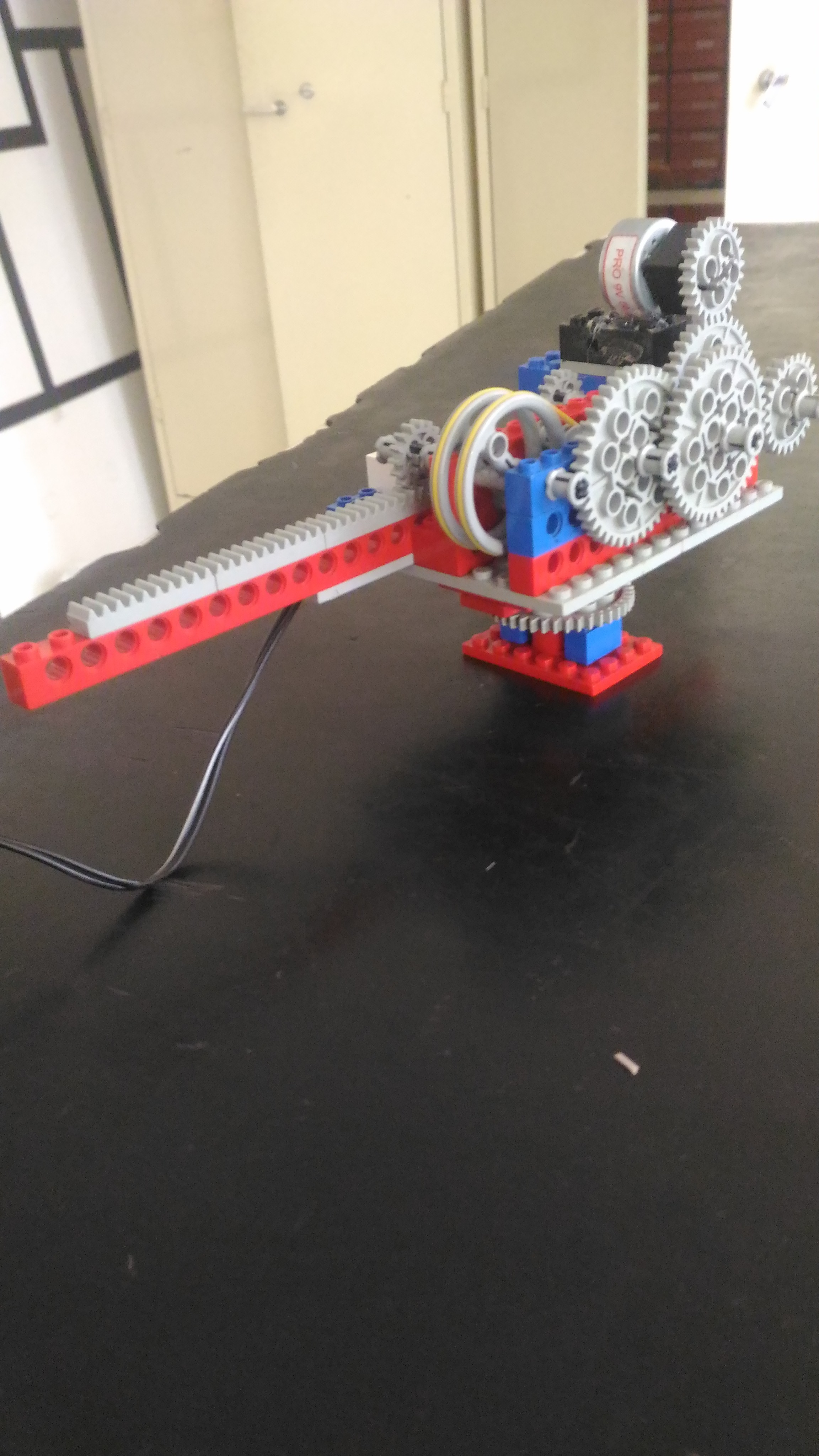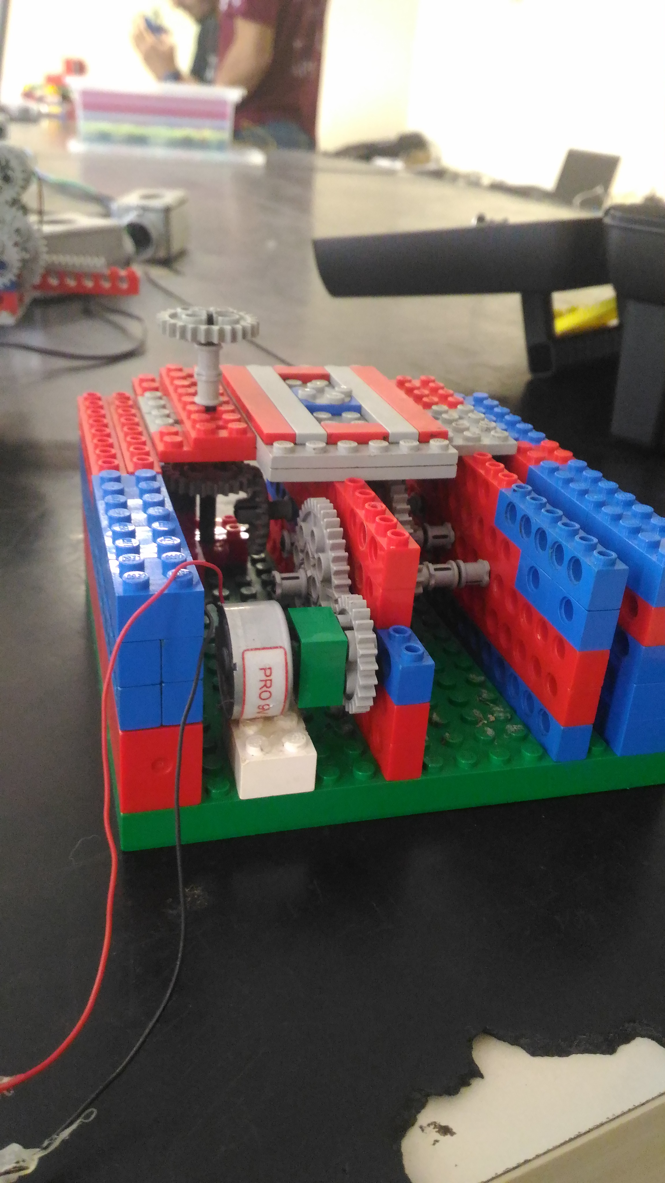 A solução para isso foi reduzir mais ainda na caixa de engrenagens inferior para que a mesma ganhasse força. Isso foi feito trocando as duas engrenagens que ligavam o eixo vertical ao horizontal que eram de tamanho grande por de tamanho médio e usar uma das grandes retiradas com uma engrenagem pequena na parte inferior.