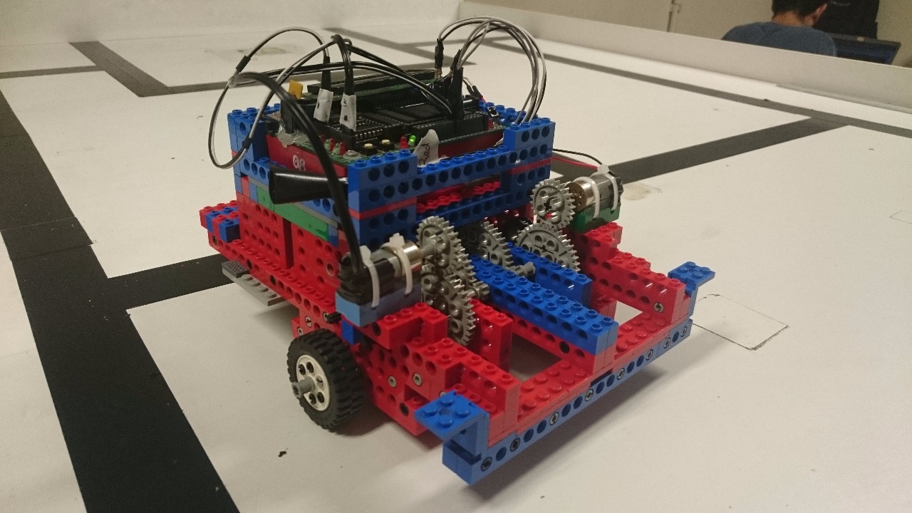 O robô é uma miniaturização de um caminhão e está montado sobre duas rodas fixas atuadas de forma independente. Tais rodas possuem seus eixos alinhados de maneira a possibilitar o movimento das rodas sem limitações relacionadas ao desbalanceamento dos eixos. Para o acionamento das rodas fixas houve uma redução de 3:25 em cada roda. Uma roda de suporte (roll on) foi adicionada a fim de garantir o funcionamento correto do robô. Os motorem foram acionados com 30% de potência. Para a aquisição de dados, um LED de três cores (RGB) foi conectado a resistores - 151 ohm para o led vermelho e 82 ohm para o verde e o azul (estes valores foram calculados considerando-se a especificação de corrente do fabricante, 20 mA, e a tensão de saída das portas utilizadas, 5V), e, posteriormente, à Handy Board nas portas de digital outputs. O LDR foi isolado do LED utilizando-se fita isolante e foi conectado na porta de analog input. Uma estrutura foi construída a fim de posicionar tanto o LED quanto o LDR. Uma estrutura adicional foi desenvolvida para restringir a distância de detecção dos blocos.