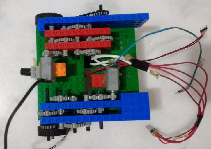 Por questões de espaço (em nossa base, não havia espaço para fixar um motor ao lado do outro), a transmissão do motor para as rodas foi construída de duas maneiras diferentes, como mostrado na figura abaixo: